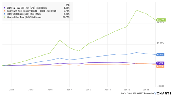 SPY, TLT, GLD, SLV (YTD % Change)