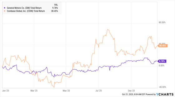 GM, COIN (YTD % Change)