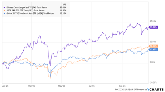 The US will likely back off Trump’s recent 100% tariff threat, while China will probably announce purchases of US soybeans and dial back some of its rare earth export restrictions. Progress toward détente helped markets rally around the world on Sunday and Monday. But it’s worth noting that the iShares China Large-Cap ETF (FXI) has been outperforming the SPDR S&P 500 ETF (SPY) all year, with gains of 35% versus 16.5% through last week. The Global X FTSE Southeast Asia ETF (ASEA) has lagged a bit, up 13.1%.