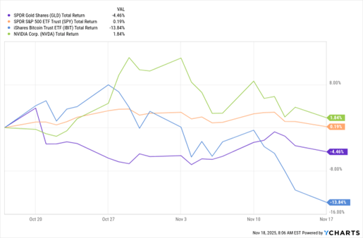 SPY, IBIT, GLD, NVDA (1-Mo.% Change)