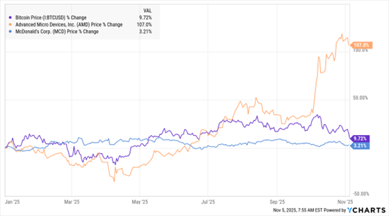 Several of this year’s hottest investments – from gold to cryptocurrencies to semiconductor and Artificial Intelligence (AI) stocks – have been pulling back recently. Bitcoin knifed through $100,000 late yesterday before regaining that key level this morning, while markets like South Korea’s that are heavily levered to technology dropped 2% overnight. The Invesco QQQ Trust (QQQ) has shed 2.6% in the last five days, while the Global X Artificial Intelligence & Technology ETF (AIQ) has slid 3.5%